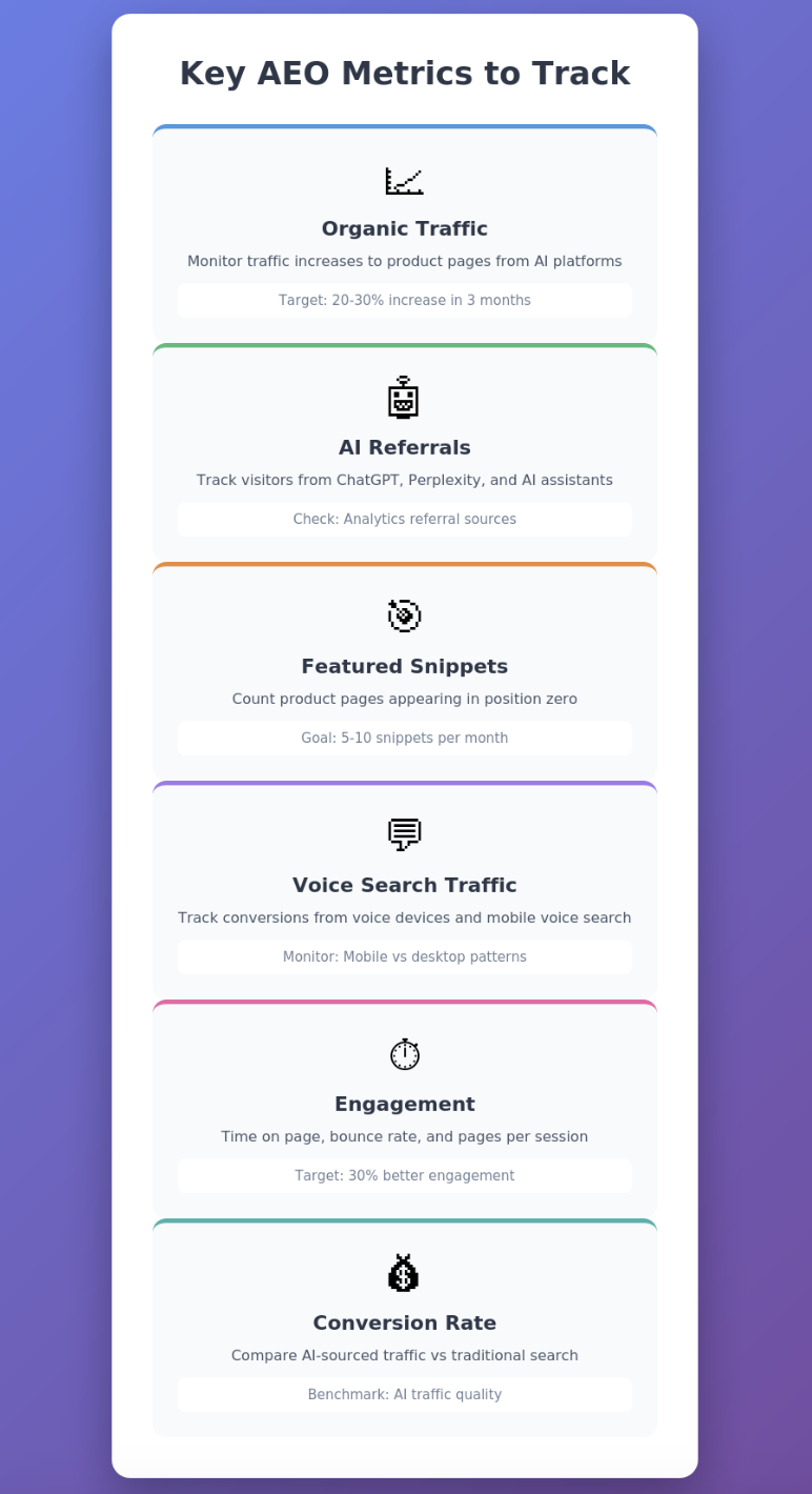 AEO focuses on optimizing your content so AI shopping assistants can find, understand, and recommend your products. Traditional SEO still matters, but AEO adds another layer. It's about making your product information clear, structured, and AI-friendly.