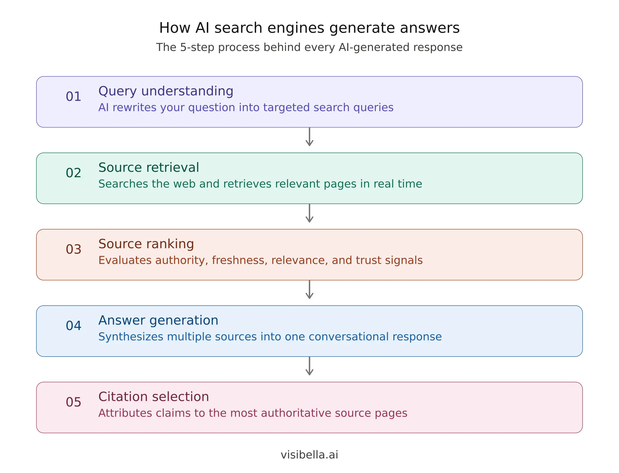 AI search engines follow a multi-step process to turn a user's question into a cited, conversational answer. While each platform has its own architecture, the general workflow involves five core stages: understanding the query, retrieving sources, ranking those sources, generating an answer, and selecting citations.