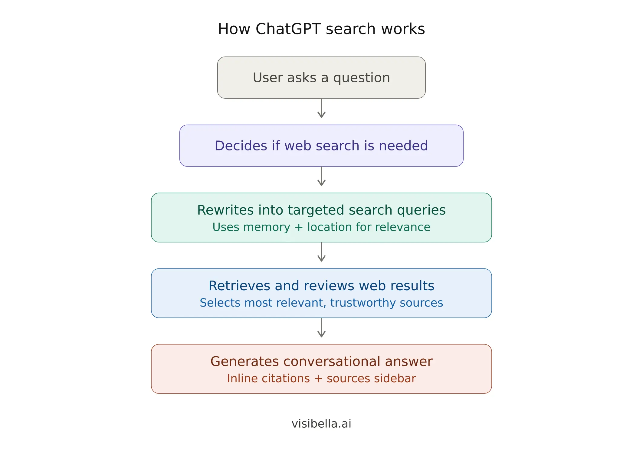 After retrieving results, ChatGPT reviews them, selects the most relevant and trustworthy sources, and generates a response that weaves those sources together into a clear answer. Every response that uses search includes inline citations and a sources sidebar where you can click through to verify the original content.
