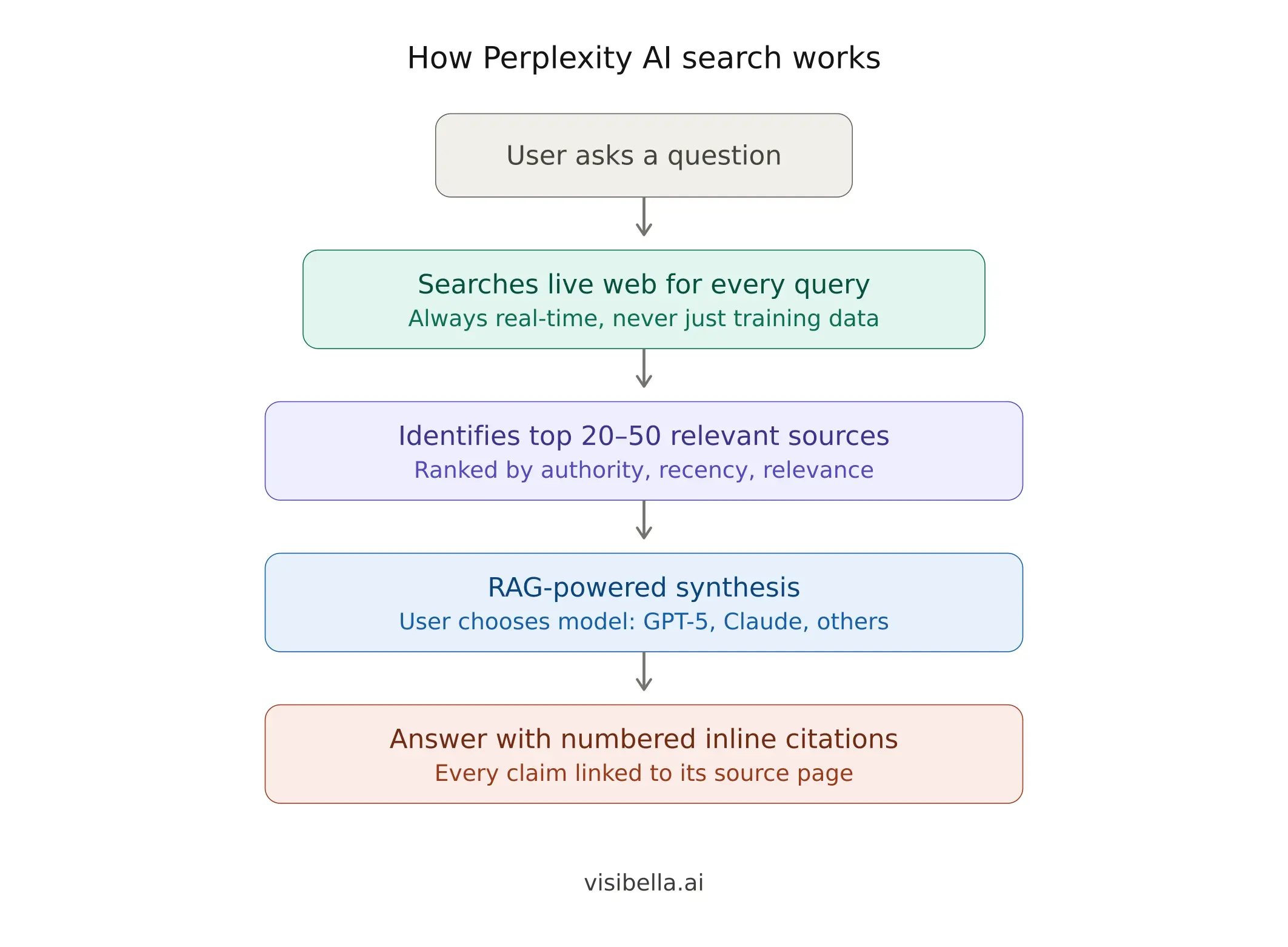 When you ask a question, Perplexity searches the web, identifies the top 20 to 50 most relevant sources based on keyword match, authority, recency, and relevance, then extracts key passages from those sources. It passes this content to a language model, where users can choose from options like GPT-5, Claude, and others, which synthesizes the information into a coherent answer. Every claim in the response gets an inline numbered citation that links back to the original source.