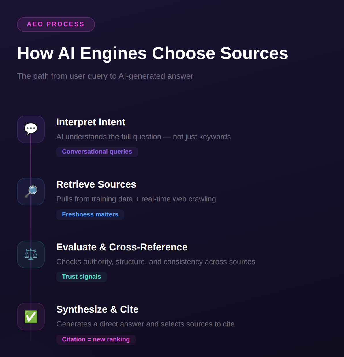This is the question that matters most for any AEO strategy. If you understand how AI platforms decide which sources to include in their answers, you can engineer your content to be selected.